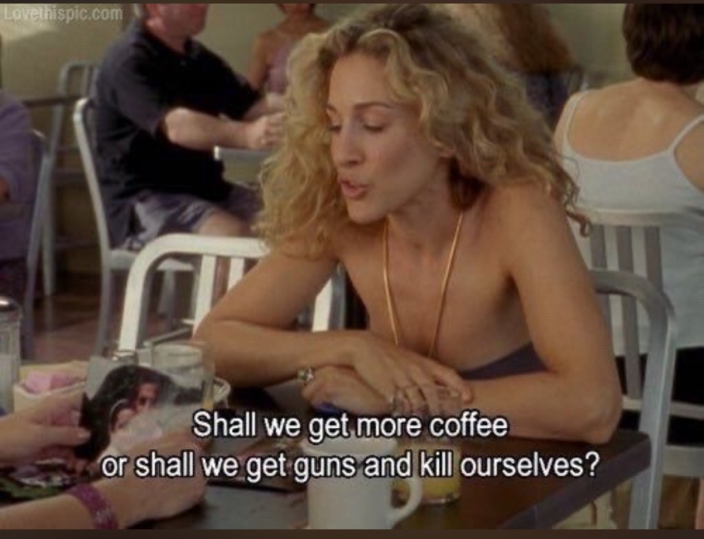 I get home and immediately spiral because is this all there is to life?! Just below the bare fucking minimum and then getting propositioned for sex? They’re getting younger and don’t even care to romance you a little before inviting themselves to YOUR home. I’m so beyond underwhelmed, I am despondent! I lie in bed and think about all the new hobbies I should embark on and what I need to do so that I am a new version of myself. I clearly seem like a woman that isn’t better than this experience so I need to fix that! I want to be so intimidating that their only options are to just leave me alone or be the poster child of romance. All the other stuff in between is a waste of time!